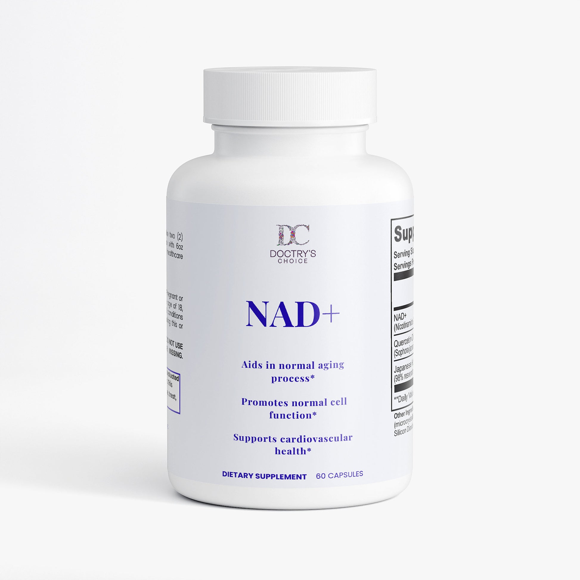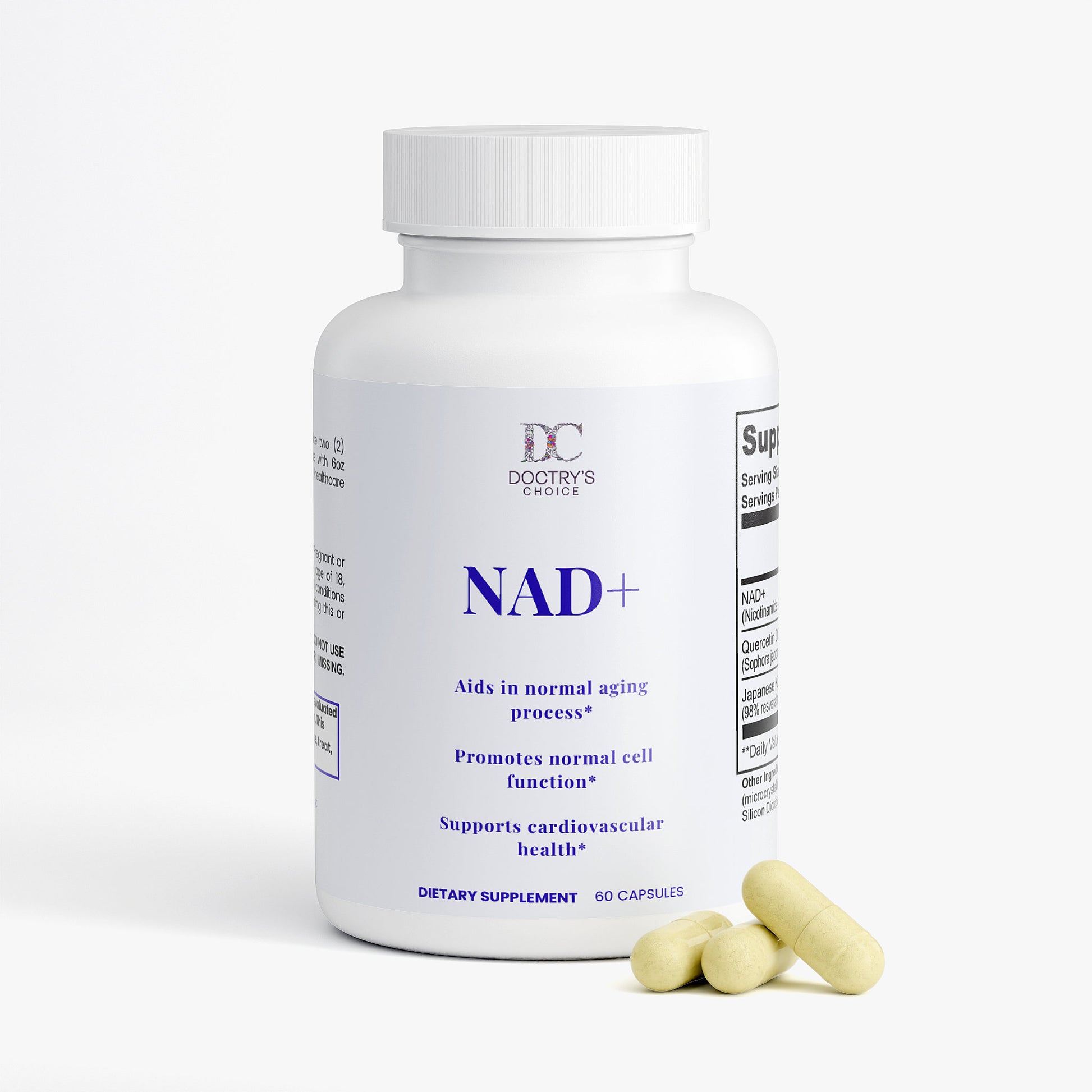 Ingredients: NAD+ (Nicotinamide Adenine Dinucleotide) (500 mg), Quercetin Dihydrate Extract (Sophora japonica) (whole flower bud) (250 mg), Japanese Knotweed Extract (98% Resveratrol) (Polygonum cuspidatum) (root) (150 mg), HPMC (vegetable capsule), Microcrystalline Cellulose (MCC), Brown Rice Flour, Olive Oil, Silicon Dioxide, Magnesium Stearate.